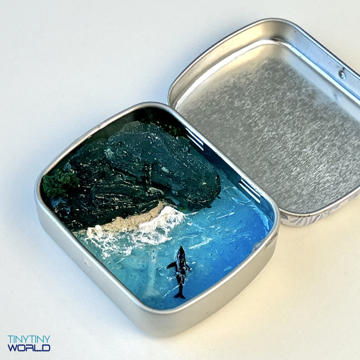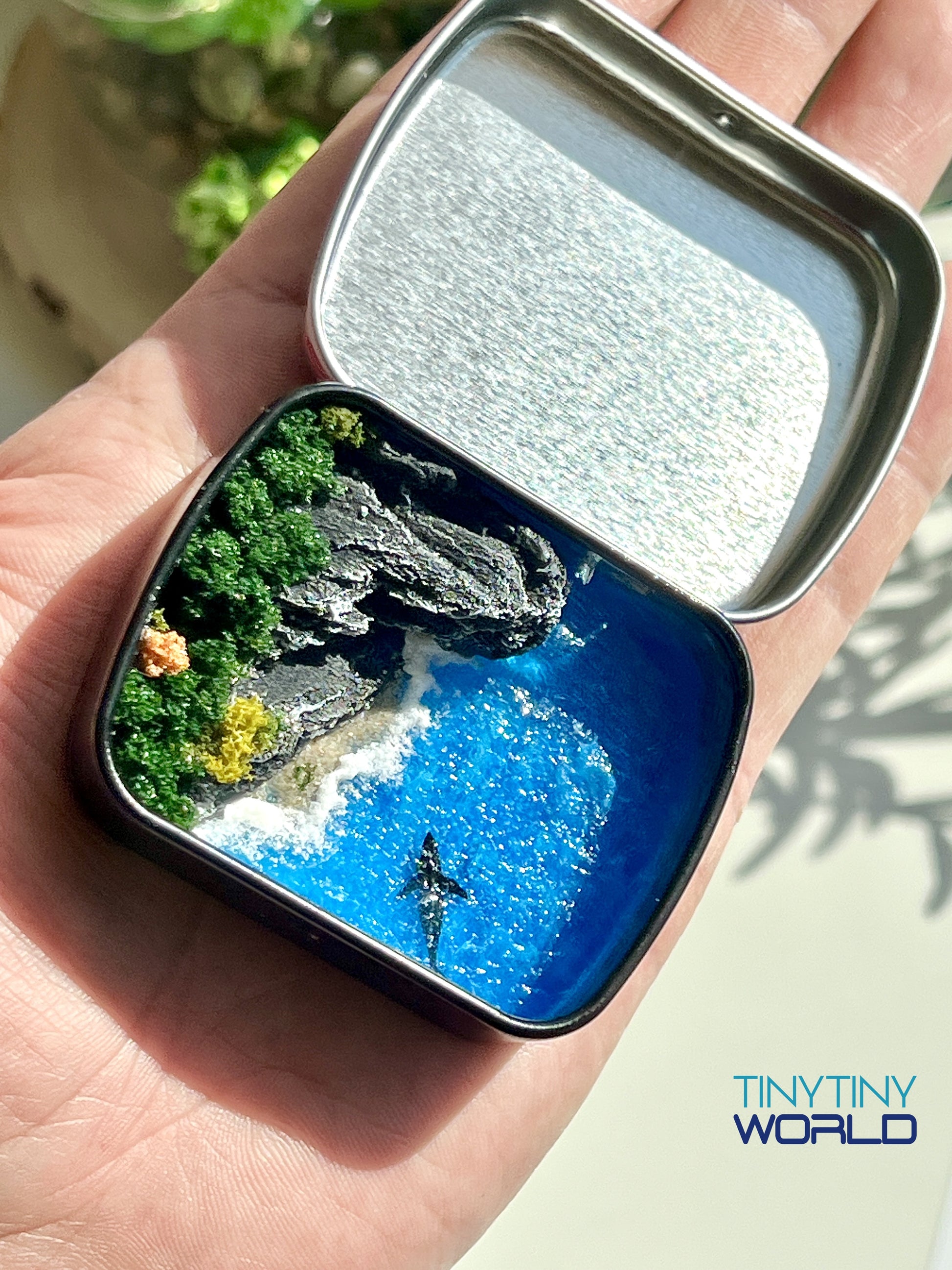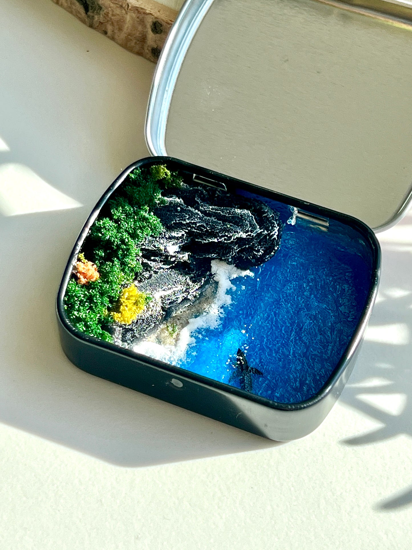 Bring the beauty of the ocean to the palm of your hand with The Coast in the Box! This stunning handcrafted display captures a serene seaside scene, complete with playful dolphins, sparkling blue waters, and soft sandy shores—all encapsulated in a compact metal box.